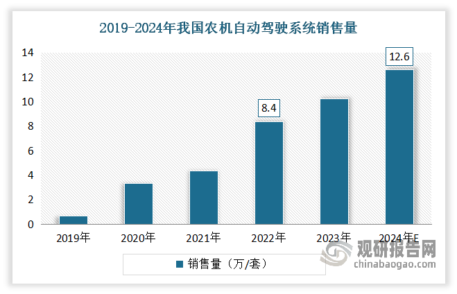 正在聪慧农业时代,农机配备的高度智能化成为显著特征,近几年跟着农业机械化成长很快,我国农机从动化系统初见成效,总体上曾经进入了高速增加期间。数据显示,2022年我国农机从动驾驶系统发卖量达8。4万/套,同比增加92。22%。估计2024年我国农机从动驾驶系统发卖量将跨越12万/套。