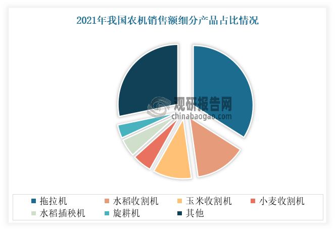 农业机械品种不竭添加,类型不竭丰硕。近年跟着农业出产程度的提高和农业出产布局的调整,农业机械的品种不竭添加,类型越来越丰硕。从保守的农业机械设备到智能化、从动化的农业机械设备,从农田耕做到农产物收割和加工,农业机械正正在不竭立异和成长。目前我国农业机械曾经涵盖了种植、畜牧、渔业等多个范畴,各类新型的农业机械如烘干机、精准灌溉、智能温室等也不竭出现。数据显示,2023年我国规模以上企业2200多家,从停业务收入2428亿元;出产14大类50小类4000多种农机产物。此中一曲以来,拖沓机正在我国农业机械市场中占比处于较高地位。以2021年的数据为例,2021年正在农业机械市场中,拖沓机发卖额占比最大,达到33。96%;其次为水稻收割机及玉米收割机,发卖额占比别离为13。82%和10。37%,