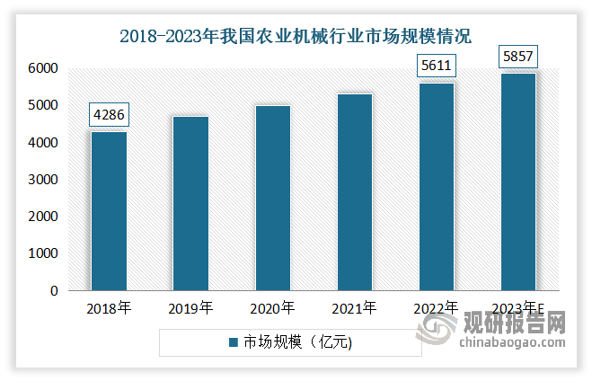 农业机械化是实现农业现代化和确保国度粮食平安不成或缺的物质根本,也是农业现代化的主要标记。当前正在我国处于从保守农业向现代农业改变的环节期间鄙人,对于提高农业配备先辈性、改善农业出产前提、加强农业分析出产能力和拉动农村消费需求具有主要意义。近年来正在《农业机械化推进法》、农机购买补助等一系列搀扶政策推进下,我国农业机械化取得了快速成长,实现质的飞跃,不只无效鞭策了国内农机配备程度和农业机械化程度的提拔,并且还支持农业各财产成长的机械化根本逐渐安稳。具体如下:市场不竭扩大。数据显示,2018-2022年我国农业机械行业市场规模由4286亿元增加至5611亿元,年均复合增加率达8。4%。估量2023年我国农业机械市场规模将正在5857亿元摆布。